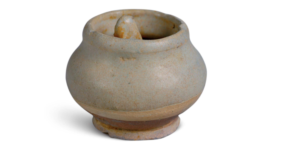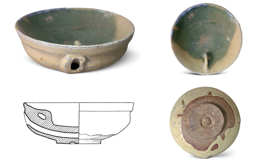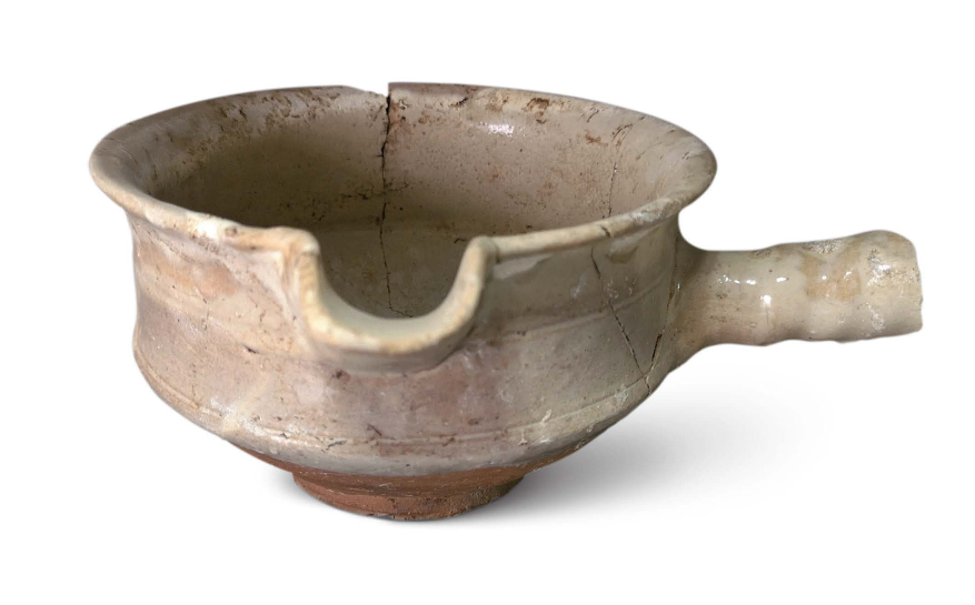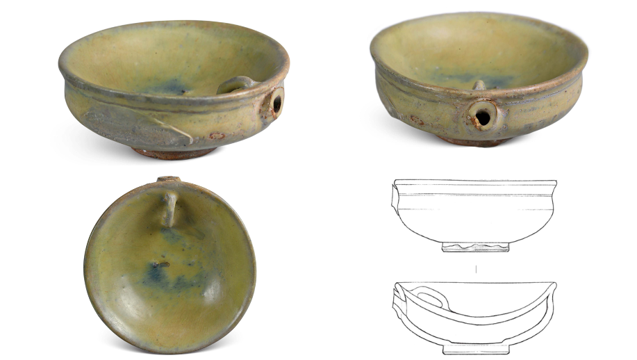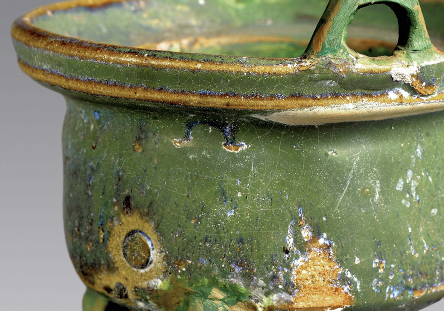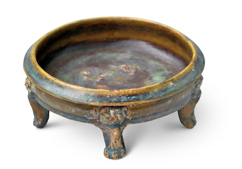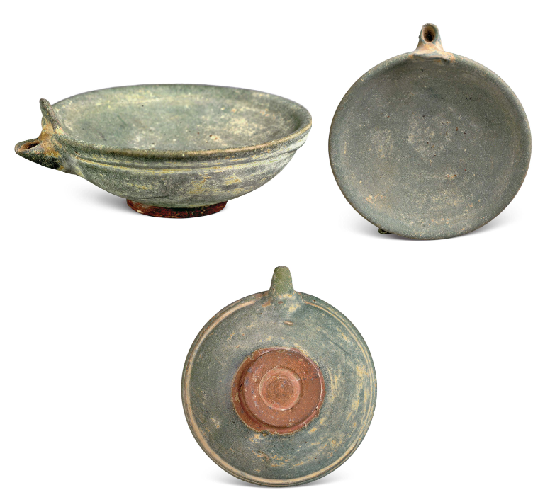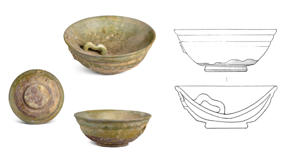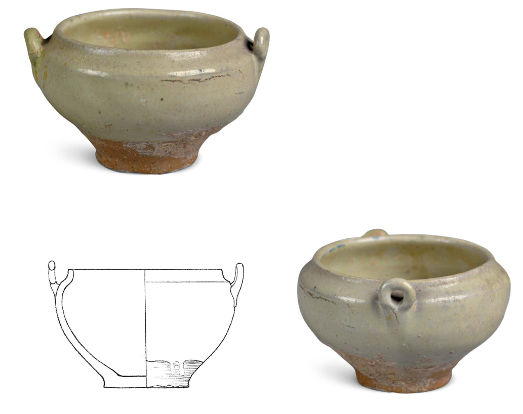 Decoration was minimalist, with milky glazed vessels mostly plain. Only multi-legged braziers featured mold-impressed animal masks on their outer sides, while vase-shaped vessels occasionally bore sawtooth or inverted triangular incisions. Green glazed bowls retained traces of green-painted grass leaves.