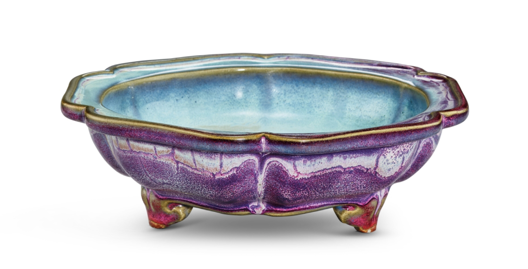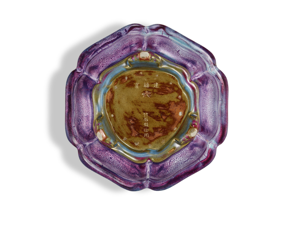 明早期 明初钧窑紫玫瑰釉三足葵式水仙盆奁底刻「六」字、「建福宫」、「竹石假山用」款