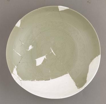On the other hand, its presence as tribute goods extended far into the Central Plains dynasties and the northern Liao territories. Northern Song imperial tombs yielded items like the cloud-and-crane patterned nested boxes (Fig. 20), dragon-patterned large plate (Fig. 21), and ring-footed bowls (Fig. 22) from Empress Dowager Li's tomb (1000 AD). The Liao Ancestral Tombs produced a dragon-and-phoenix patterned large plate (Figs. 23, 24), while the joint tomb of Princess Chen and her consort yielded celadon ware inscribed with the character “官” (Fig. 25), ji-marked plate (Fig. 26), celadon ewer (Fig. 27), phoenix-decorated bowl (Fig. 28), and Capricorn-patterned basin (Fig. 29) from the tomb of Consort Xiao of Liao, a cup and its saucer (Fig. 31), and a ring-footed dish (Fig. 32) unearthed from the tomb of Liao nobleman Han Yi (995 AD) are all regarded as secret-color celadon. These treasures, scattered like stars across the historical cosmos, collectively trace the dazzling network woven by secret-color celadon as both a supreme commodity and a political gift.