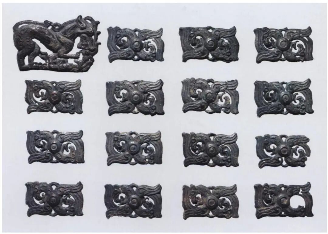 Additionally, the horse tack fittings and belt plaques from southern Ningxia and southeastern Gansu differ markedly from the burial goods found in tombs of the Ordos region. The horse tack accessories primarily consist of small rein fittings and larger decorative plaques.