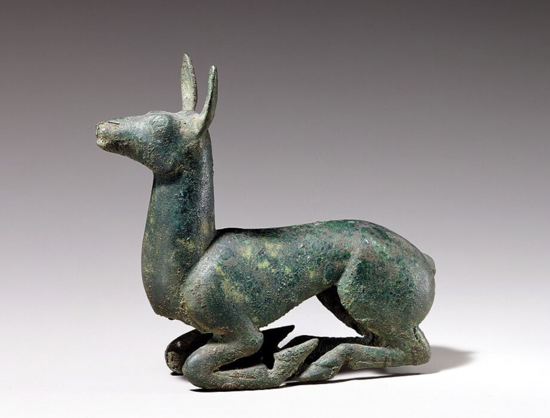 This standing doe originally belonged to a chariot decoration. It features almond-shaped eyes indicated by incised lines and an open mouth. The feet are connected by a horizontal band that serves as a base line, accentuating the slender legs. The statue was cast hollow, retaining some casting cores. Traces of red cinnabar are visible on the face.