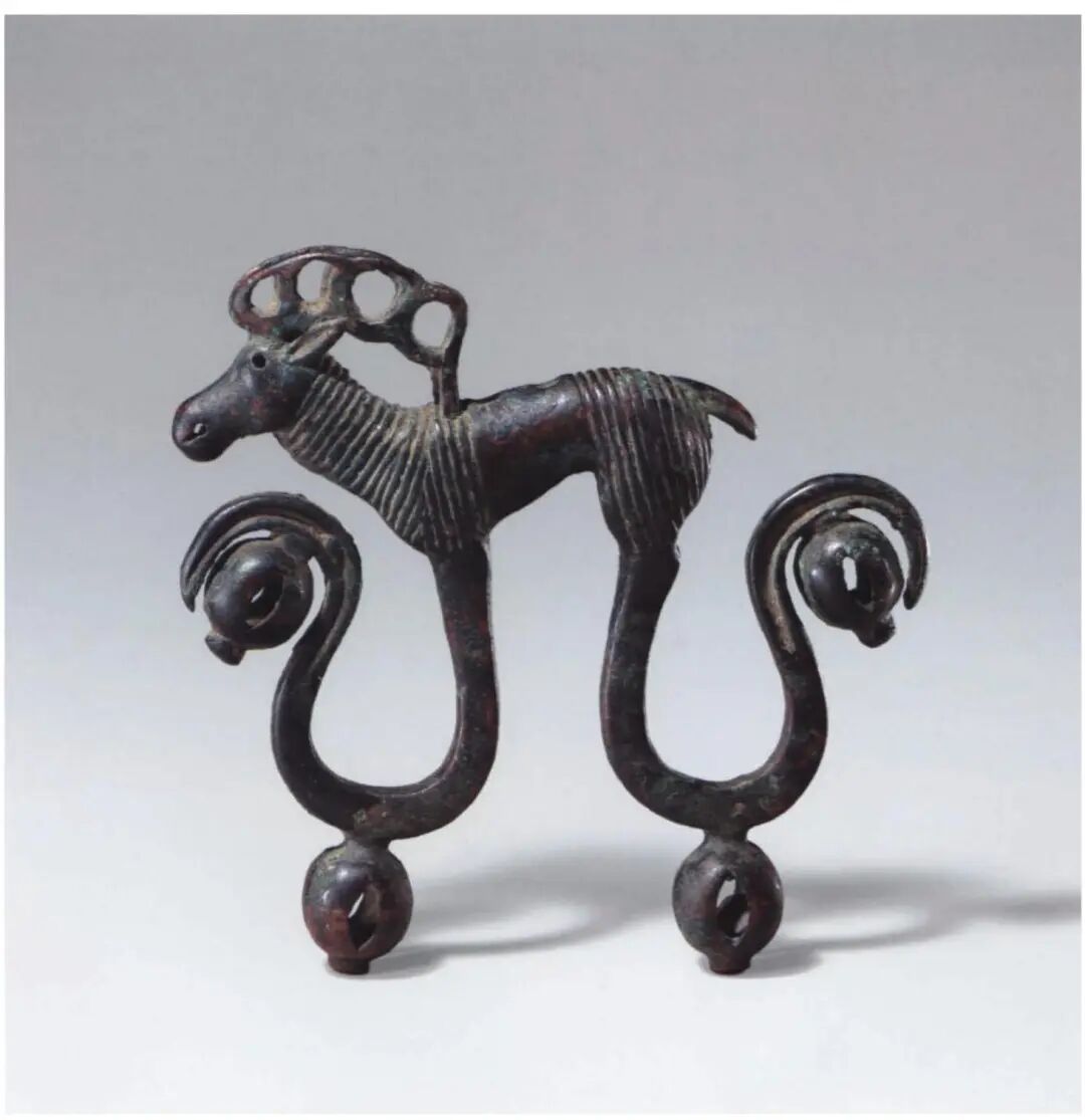 Some animals depicted on the yoke ornament are in a reclining posture, which differs significantly from the depictions of hoofed animals on artifacts from the Northeast region, where the latter appear to be running. In the Ordos region, the reclining animal is a red deer. Its legs are crossed, with the soles of the front hooves facing upward and those of the hind hooves downward. This posture originates from the artistic traditions of the Qin state and can be traced back to the Shang dynasty. Furthermore, this distinctive depiction of hooves also appears in contexts from the Black Sea region during the 5th century BCE.
