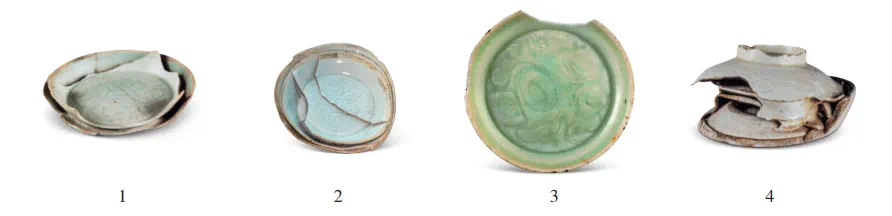 B-type disc-shaped branch rings are frequently unearthed from the Hutian kiln site in Jingdezhen. Scholars believe in the book "Jingdezhen Hutian Kiln Site" that the Hutian kiln's use of this type of kiln furniture to decorate Mangkou wares appeared around the middle of the Northern Song Dynasty, and in the latter part of the third period [Jianzhong Jingguo first year (1101) to Jingkang II year (1127)] became widely popular. Liu Xinyuan first proposed that this type only appeared in the early Southern Song Dynasty [51], and later believed that it should belong to the late Northern Song Dynasty to the early Southern Song Dynasty [52]. The utensils adhered to the B-shaped disc-shaped support ring are mainly flat-bottomed dishes and ring-footed bowls, and the decorations are mostly carved with local characteristics of Hutian.The report did not provide specific basis for the dating of these artifacts. The flat-bottomed dish is 99H·F1:208[53] belonging to the Hutian kiln site (Fig. 6:1) and the example in the Jingdezhen Kiln Museum (Fig. 6:2). Both of them are similar to those unearthed from the Nanhai No. 1 shipwreck (around 1183). [54] (Figure 6:3) are basically consistent with the later examples unearthed from the Jinyu Village cellar in Suining. Most of the bowls with ring feet are carved on the outer wall, and specimens of the adhered objects include 97GT4 ③: 200 [55] (Figure 6: 4). This type of product is rarely found outside the kiln site.