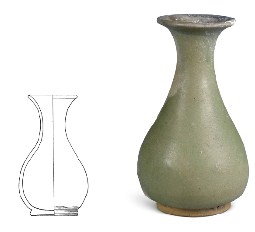 Bowls, plates, and cups predominantly feature rounded, flared, or pointed rims with straight or sloping walls; occasionally, tapered walls appear. Ring-footed bases become the norm, characterized by low, flat-cut footwalls, some retaining nipple-like protrusions, while disc-footed bases gradually disappear. Newly discovered deep-bowled cups with ring bases featured outward-curving rims forming concave grooves. Bottle-shaped vessels popularized the slender-necked, bulbous-bodied “jade-huchun” style. Incense burners became shorter, with multi-legged burners resting on disc bases and hoof-shaped bases shortening. Ding-style and box-style burners also appeared. Lids predominantly featured domed knobs with knobs on the rim. The bodies became lighter and thinner. Opaque milk glaze was used to conceal flaws, and slip coating was largely discontinued. Only occasionally did celadon wares show traces of beige slip coating, and glazing still mostly stopped at the middle of the body. The milk glaze adhered tightly to the body, presenting a semi-wood-gloss finish with glaze drips and fine craquelure. A few pieces were smooth and glossy with brown spots.