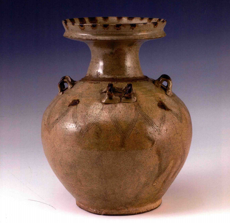 Eastern Jin Dynasty Celadon Vase with Brown-Glazed Incised Petal Design and Four Handles
