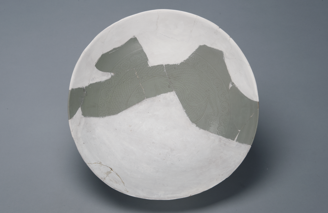 On the other hand, its presence as tribute goods extended far into the Central Plains dynasties and the northern Liao territories. Northern Song imperial tombs yielded items like the cloud-and-crane patterned nested boxes (Fig. 20), dragon-patterned large plate (Fig. 21), and ring-footed bowls (Fig. 22) from Empress Dowager Li's tomb (1000 AD). The Liao Ancestral Tombs produced a dragon-and-phoenix patterned large plate (Figs. 23, 24), while the joint tomb of Princess Chen and her consort yielded celadon ware inscribed with the character “官” (Fig. 25), ji-marked plate (Fig. 26), celadon ewer (Fig. 27), phoenix-decorated bowl (Fig. 28), and Capricorn-patterned basin (Fig. 29) from the tomb of Consort Xiao of Liao, a cup and its saucer (Fig. 31), and a ring-footed dish (Fig. 32) unearthed from the tomb of Liao nobleman Han Yi (995 AD) are all regarded as secret-color celadon. These treasures, scattered like stars across the historical cosmos, collectively trace the dazzling network woven by secret-color celadon as both a supreme commodity and a political gift.