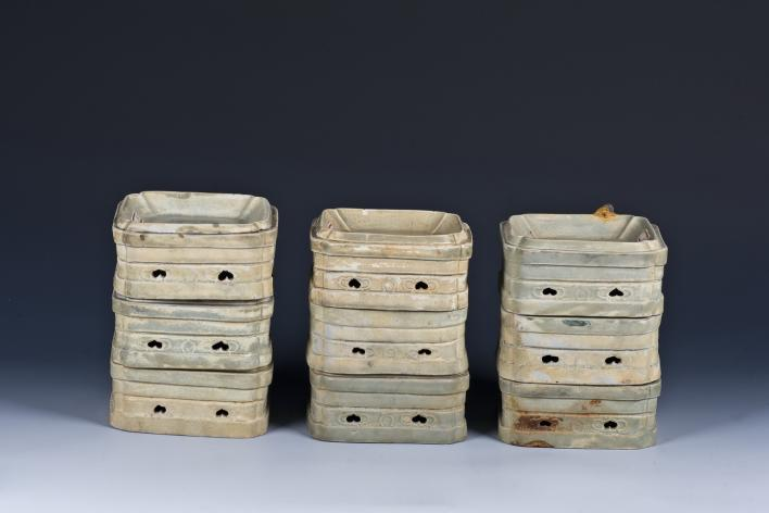 However, where were these exquisitely crafted secret-color celadons produced? Excavations at the Housiaoyao kiln site in Cixi, Zhejiang Province, from 2015 to 2017 (selected as one of China's Top Ten Archaeological Discoveries of 2016, Figures 33-35), finally pinpointed the precise origin of this legendary celadon hue. These excavations not only confirmed the kiln site as the core production center for secret-color porcelain during the late Tang, Five Dynasties, and early Northern Song periods, but also established a complete chain from production to use through a series of key evidence: Beyond matching forms and body-glaze characteristics, individual porcelain kiln shelves excavated at the site bore clear inscriptions reading “Luohu Master's Secret-Color Bowl” (Fig. 36), directly attesting to its production of “secret-color porcelain.” Fragments of an octagonal ewer discovered at the kiln site matched the base markings of an octagonal ewer unearthed from the Famen Temple underground palace exactly (Fig. 37). These discoveries act as a key, definitively solving the mystery of the secret-color porcelain's origin and establishing its production-distribution relationship on a solid archaeological foundation. They also unravel the mystery of its manufacturing techniques: The highest-grade porcelain clay (Fig. 38), celadon glaze, meticulously polished bodies, strong reduction firing using porcelain kiln shelves with glaze-sealed openings (Fig. 39), diverse forms (Fig. 40), and an aesthetic emphasizing form and glaze color—all these elements collectively established the technical and aesthetic foundations of China's highest-grade celadon.