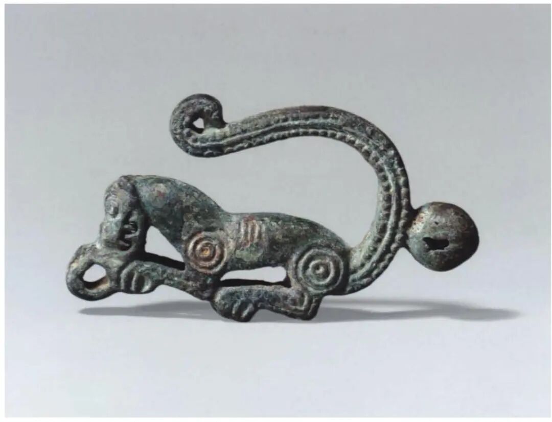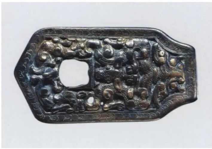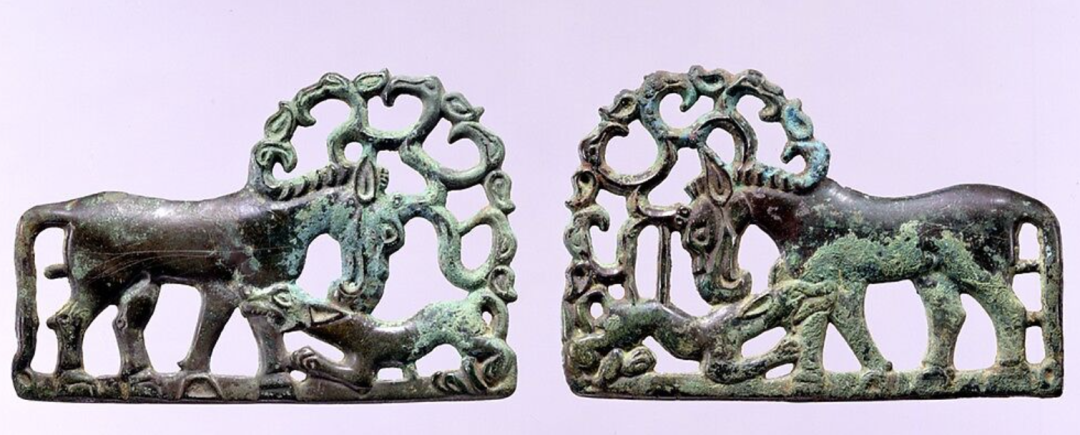 Large belt buckles depict a standing carnivore tearing into an injured herbivore. These buckles were cast in mirrored pairs and often tin-plated to achieve a bright silver surface. Such belt buckles first appeared in the Tagar culture of Minusinsk, Siberia, and were also found among nomadic groups in the Altai Mountains. This indicates long-distance trade links between Minusinsk, the Altai Mountains, and Guyuan-Qingyang, while similar buckles did not appear near Ordos during the same period.