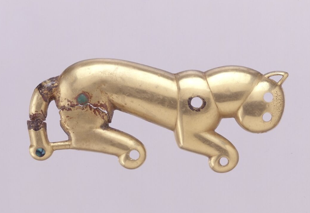 This gold breastplate depicts a leopard crouching in profile. Turquoise inlays once marked the tip of the tail, shoulders, hips, paws, eyes, and mouth, though only two inlays remain today. A short support rod connects the tail to the hind legs. The reverse is hollow, featuring two vertical connecting rings—one behind the neck and another behind the hindquarters. The panel was cast using the lost-wax method. The rear legs and tail were previously broken off but have recently been reattached.