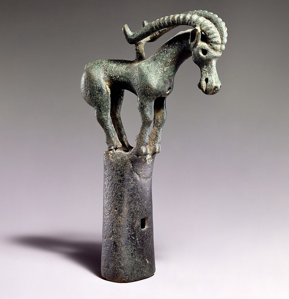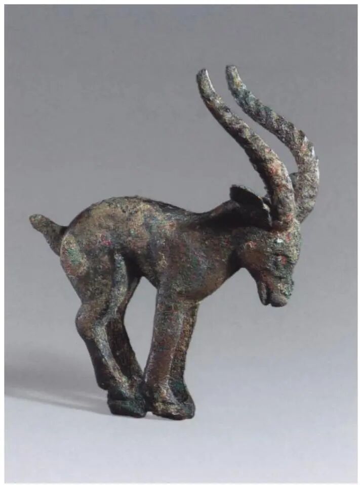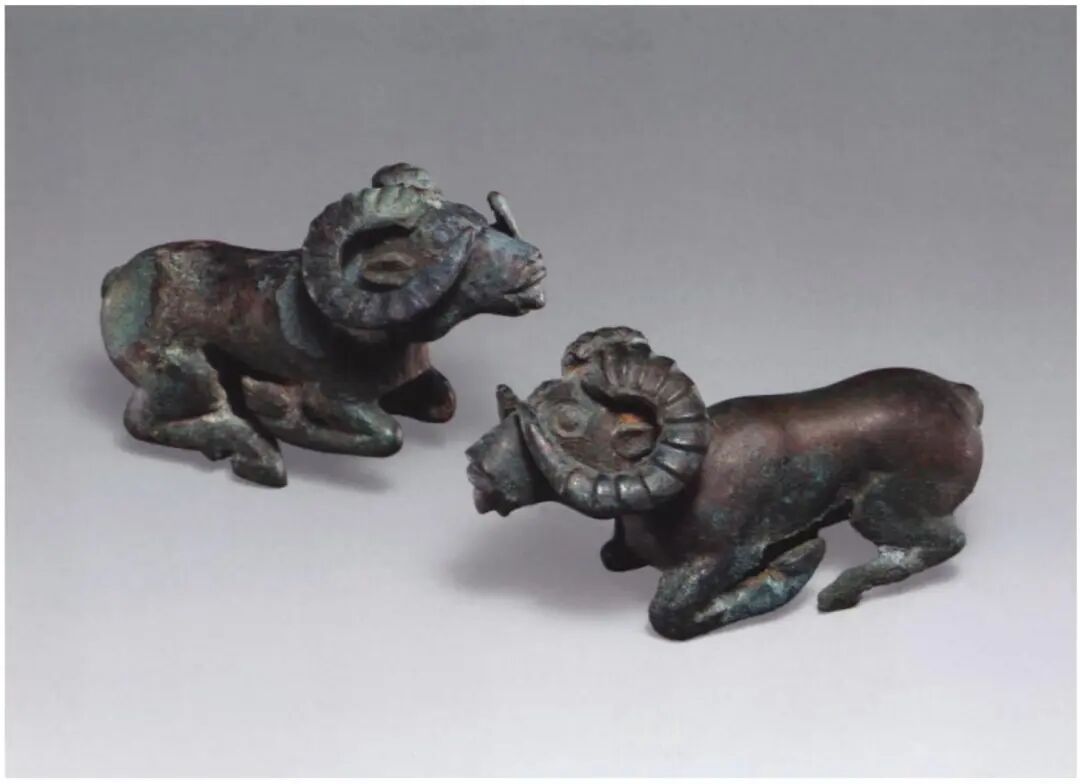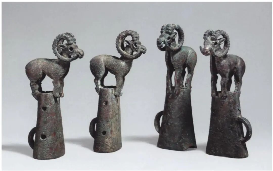 Another distinctive type of artifact craftsmanship involves bronze finials cast using the lost-wax method, featuring standing animals atop them. Similar bronze finials cast by the lost-wax method, bearing standing wild sheep on their tops, have been discovered in southern Siberia dating from the 7th to 6th centuries BCE. These finials were used to adorn the corner posts of canopies placed above coffins during funeral ceremonies.