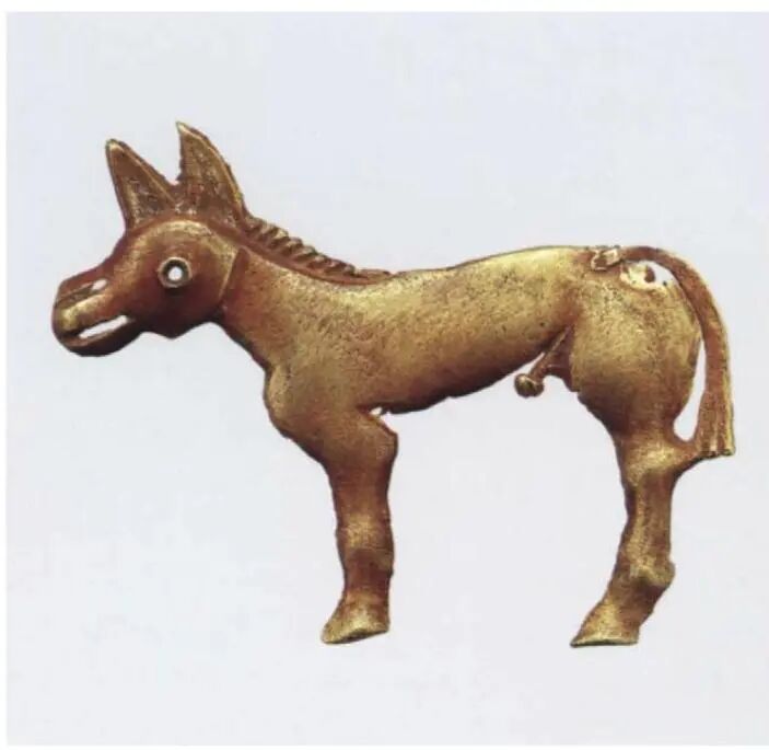 This gold ornamental plate depicts a standing male kulan, symbolizing the wearer's status as a badge worn on the chest. The kulan is rendered in profile, depicted with only two legs, though both ears are rendered, with the mane indicated by raised striations. Its identity is confirmed by the oversized ears and the tassel at the tail's end. The reverse features two vertical V-shaped rings for attachment, one behind the muzzle and the other behind the hindquarters. The panel's edges are notably uneven, suggesting casting from a two-piece mold. It shows minimal cleaning, with traces of red cinnabar from the burial ritual still visible on the head. The tail appears to have been reattached in antiquity, as this is not a recent repair.