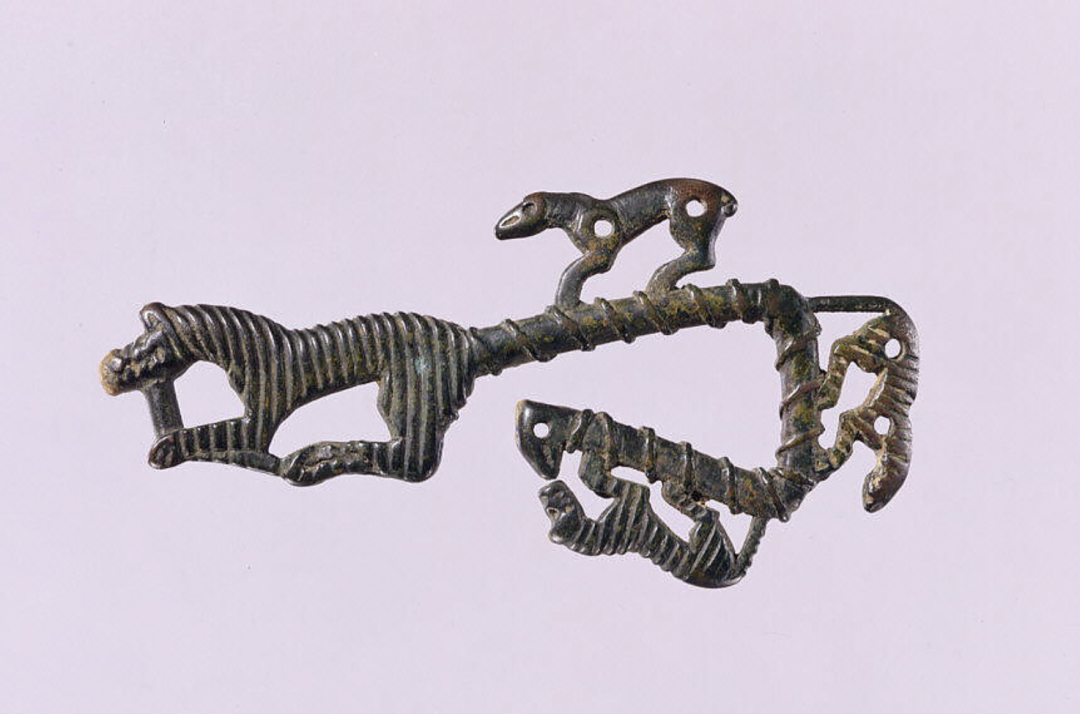 This hook-shaped horse harness ornament depicts a tiger whose long tail terminates in a stylized bird's head. A doe and two additional felines are rendered along the tail, which serves as the ground line and forms the hook. Ribbed lines representing stripes mark the tiger's fur, while the doe's body remains undecorated. A connecting rod linking the tiger's lower jaw to its foot serves as the suspension ring. Cast using the lost-wax method with a two-part mold, the ornament's raised spiral pattern encircling the tail may have been formed by winding cord around the wax mold.